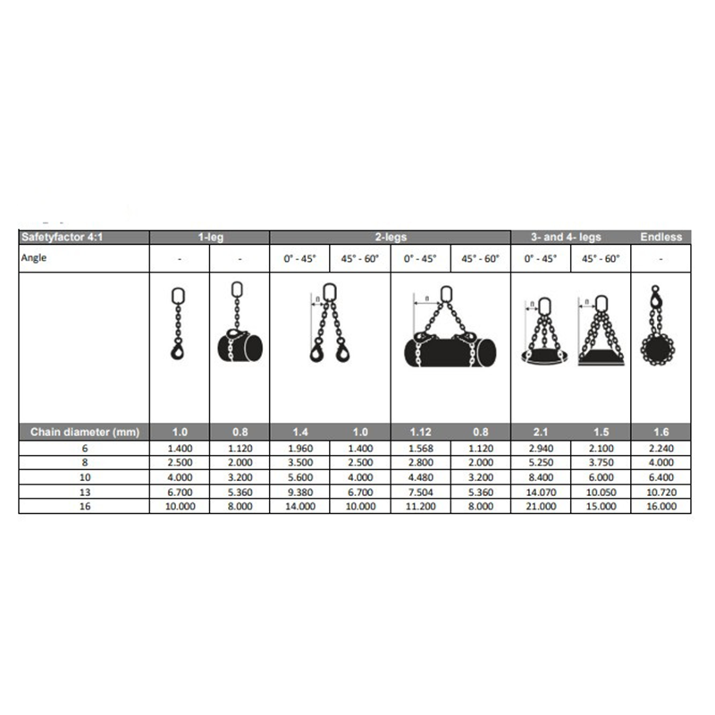 - De 8 mm Grade 100 hijsketting heeft een veilige werklast van 3,75 ton onder een hijshoek van 90 graden, zoals aangegeven in de hijstabel. Dit betekent dat de ketting veilig gebruikt kan worden om lasten tot 3,75 ton te hijsen, mits de hijshoek recht omhoog (90 graden) is en de juiste werkomstandigheden worden nageleefd.