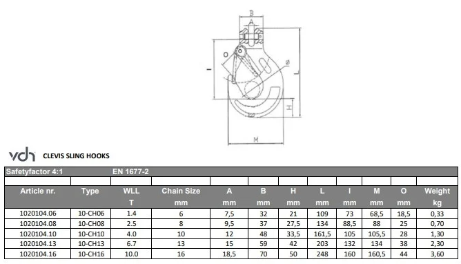 Deze VDH klephaken zijn vervaardigd uit Grade 100 staal en voldoen volledig aan de EN 1677-2 norm.