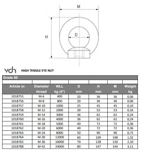 De VDH HW stalen oogmoer is een hoogwaardige hijscomponent, vervaardigd uit Grade 80 staal en speciaal ontworpen voor veilig en betrouwbaar gebruik bij zware hijstoepassingen. Dankzij de safetyfactor van 4:1 voldoen deze oogmoeren aan de strengste veiligheidsnormen en bieden ze maximale betrouwbaarheid in elke situatie.