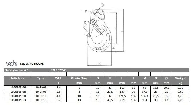 De VDH Ooghaak met Veiligheidsklep – Type 10-EH biedt een uiterst betrouwbare en veilige oplossing voor zware hijstoepassingen. De haak is vervaardigd uit Grade 100 staal en staat garant voor een optimale sterkte en duurzaamheid, zelfs onder de meest veeleisende omstandigheden.
