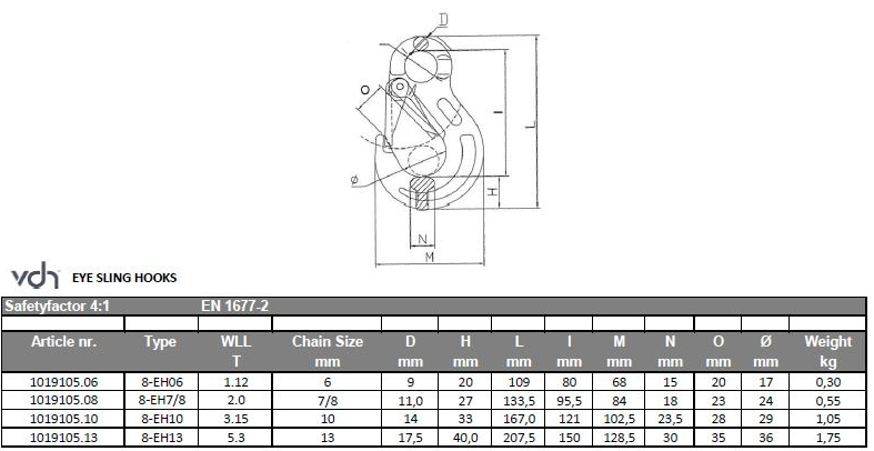 De VDH klephaak, type EH, is uitgerust met een robuuste gesmede klep. De veiligheidsklep wordt beschermd door een slijtvlak op de haak. De oogklephaak wordt met een verbindingsschalm gemonteerd aan de bijbehorende ketting en/of topschalm. Daarnaast kan deze haak worden toegepast in samenstellen met hijsbanden en rondstroppen. De VDH klephaken zijn vervaardigd uit grade 80 staal en voldoen aan de EN 1677-2 norm.